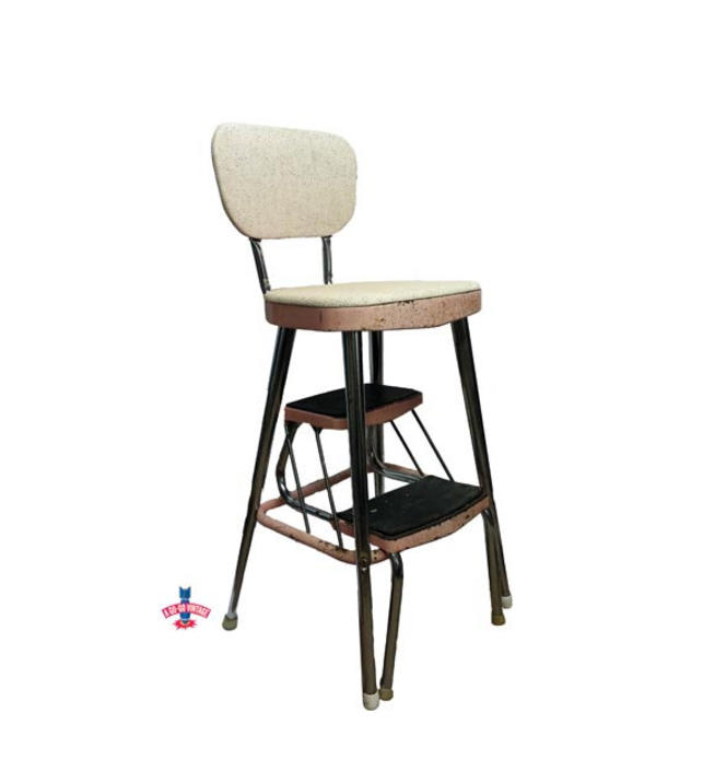 Found this 1950s era at an antique mall along Route 66 in Oro Grande. Sadly it has a bit of damage but it seems to be vintage damage. The stuffing and wood has been attractively yellowed. Unlike the more common Cosco stools where the steps are pulled out this one has steps that fold upside down when not in use. Retro Step Stool with Chair Find Similar Items . Replacement Parts Available. More Info. Find Parts. Related Items. See All . Item# 81009 Quick Info. Ascent Mighty Multi-Position Ladder 17ft. Aluminum 300lb. Capacity, Model# AHL-17 Reg. $ 119. 99.
